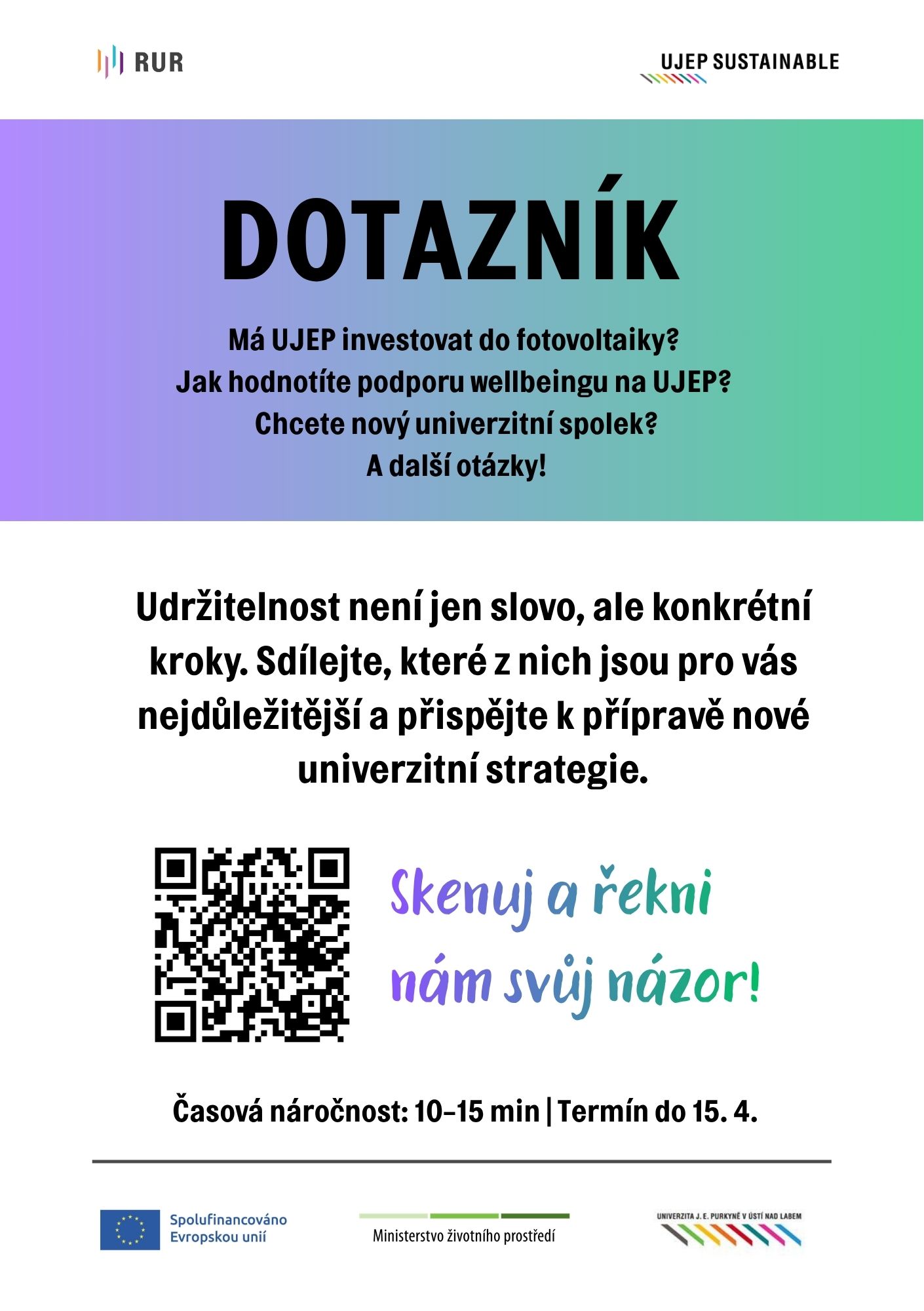 Zároveň Vás zveme v úterý 28. 4. 2026 v čase 14:30–16:30 na setkání k udržitelnosti na UJEP, na kterém představíme výsledky dotazníku a budeme diskutovat o zaměření univerzitní strategie udržitelnosti. Rádi se s Vámi potkáme i osobně.