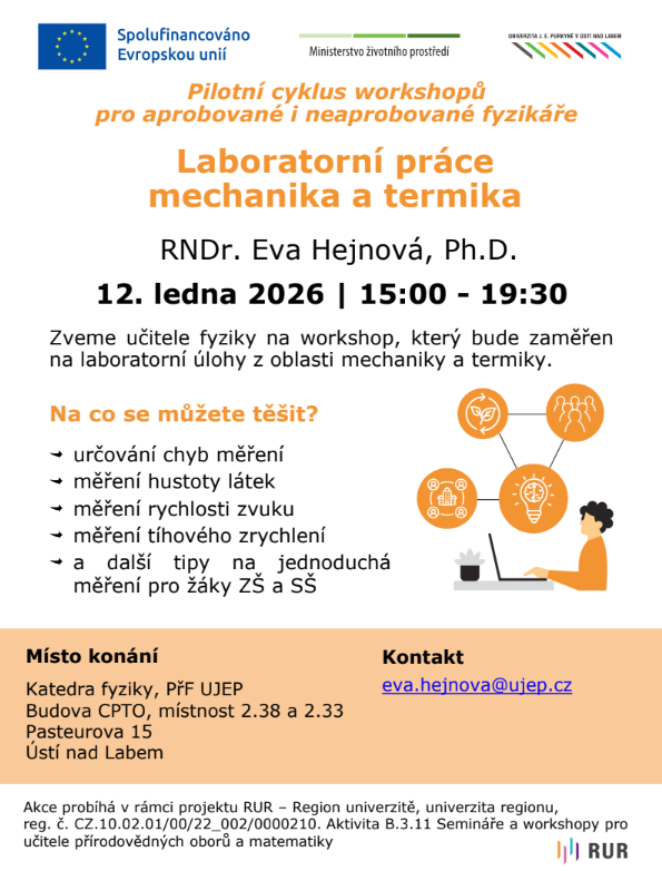 V rámci druhého cyklu workshopů pro aprobované i neaprobované fyzikáře vás zveme na první workshop zaměřený na laboratorní práce z mechaniky a termiky, který se koná v pondělí 12. ledna 2026 od 15 h do 19.30 h v místnosti 2.38 a 2.33 na katedře fyziky (2. p.) v budově CPTO,