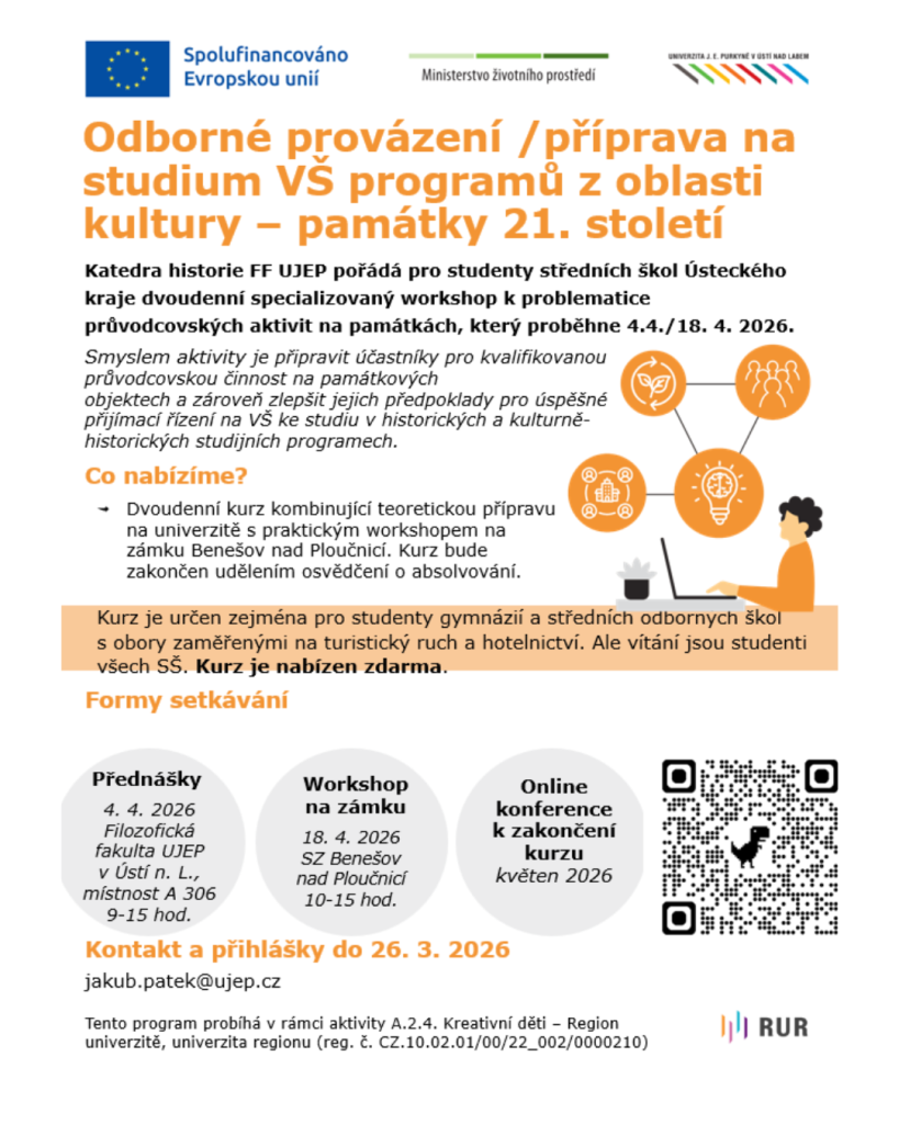 • Kde: 4. 4. 2026, Filozofická fakulta UJEP v Ústí n. L., Pasteurova 13, místnost A 306 9-15 hod. a 18. 4. 2026, Státní zámek Benešov nad Ploučnicí, 10-15 hod.
