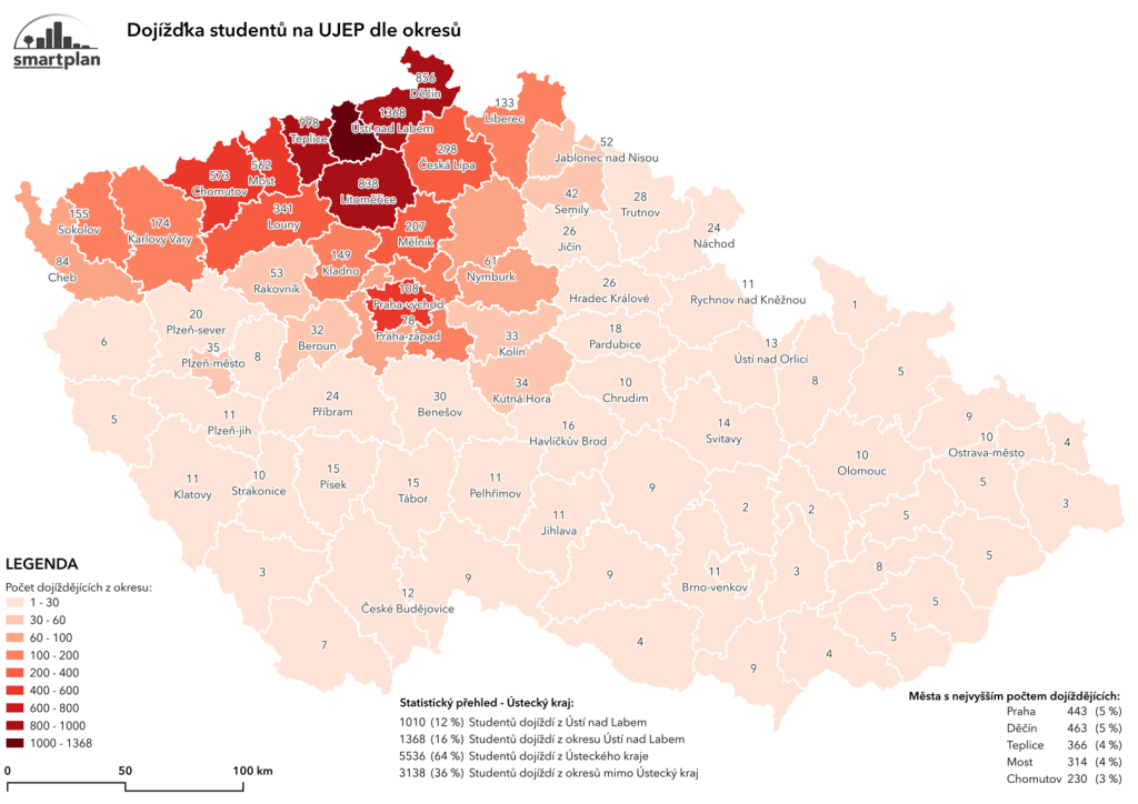 Studenti: Koncentrace je kromě logického Ústí a Ústeckého kraje výrazně dále rozprostřena do Karlovarsko, Liberecko a Středočeský kraj vč. Prahy; vyšší koncentrace v okresních městech. UJEP tak pro studenty tvoří zcela jasný spádový bod vyššího vzdělání na severu Česka.