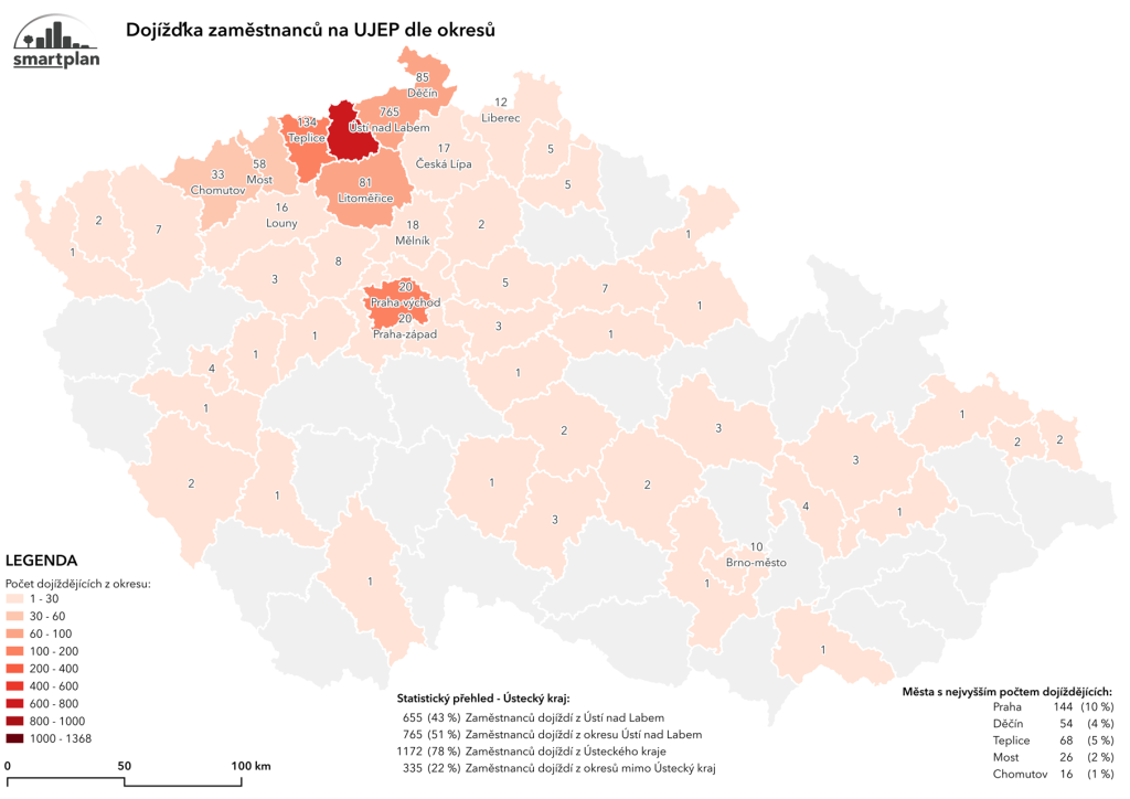 U zaměstnanců je patrná výraznější lokální koncentrace v okolí Ústí nad Labem a v sousedních okresech Teplice, Děčín a Litoměřice. Současně je však stále znatelný silný vztah k Praze, což ukazuje na širší zázemí univerzity. Rozložení bydliště zaměstnanců výrazně kopíruje kvalitu dopravního spojení, zejména železniční infrastrukturu. Z dat je patrné, že zatímco pro studenty je UJEP hlavním dopravním cílem, u zaměstnanců tento efekt není tak výrazný – jejich dopravní chování ovlivňuje více kvalita spojení a dostupnost jednotlivých lokalit než samotná přítomnost univerzity.