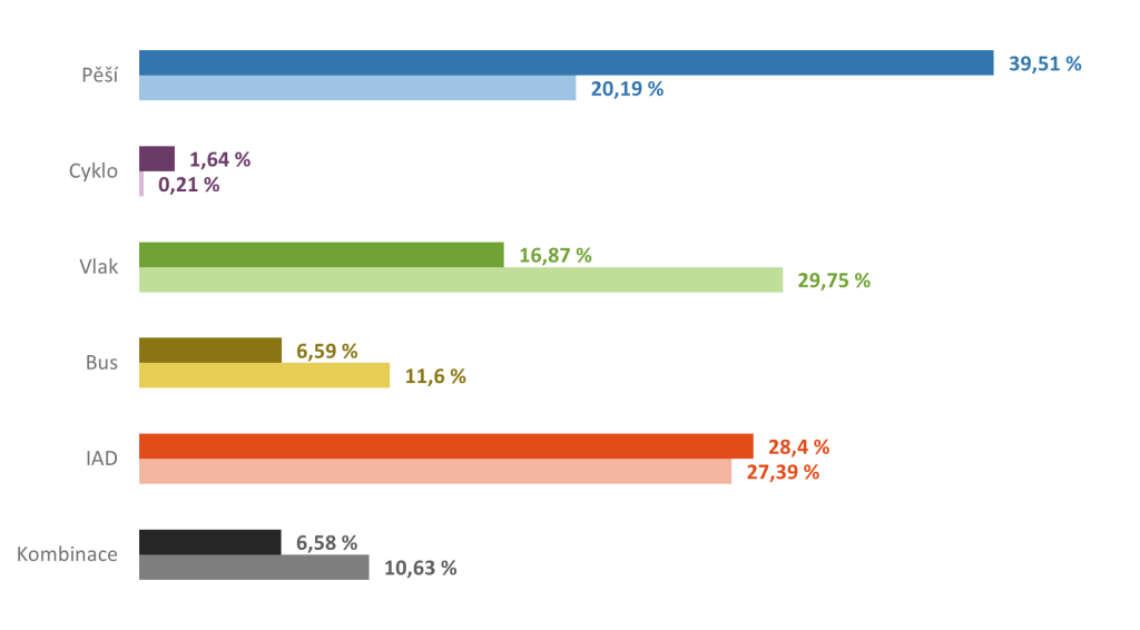 Rozdíly mezi ženami a muži již nejsou tak zásadní. Obecně lze říci, že muži častěji jezdí autem a chodí pěšky, zatímco ženy se více spoléhají na veřejnou hromadnou dopravu. Rozdíly jsou však řádově v jednotkách procentních bodů.