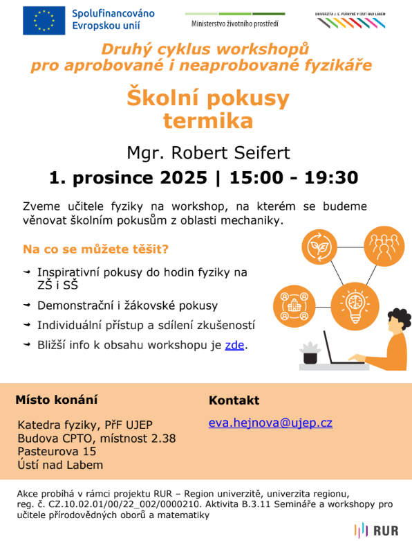 V rámci druhého cyklu workshopů pro aprobované i neaprobované fyzikáře vás zveme na první workshop zaměřený na školní pokusy z oblasti termiky, který se koná v pondělí 1. prosince 2025 od 15 h do 19.30 h v místnosti 2.38 na katedře fyziky (2. p.) v budově CPTO, Pasteurova 15, Ústí nad Labem.